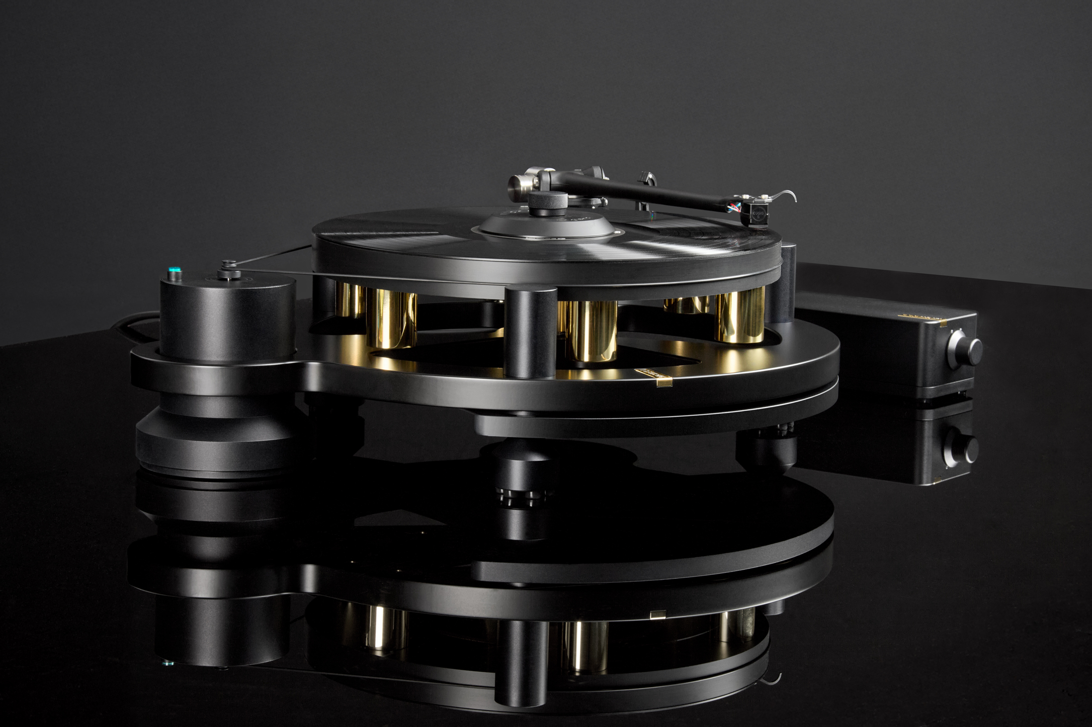 Evoluzione del classico modello GyroDec, telaio in alluminio da 19 mm di grado aerospaziale con contrappesi in ottone, ottimizzazione strutturale e del controllo delle vibrazioni, sospensione con smorzamento laterale, base in alluminio, piedini in sorbotano, nuovo alimentatore, perno invertito a doppia elica.