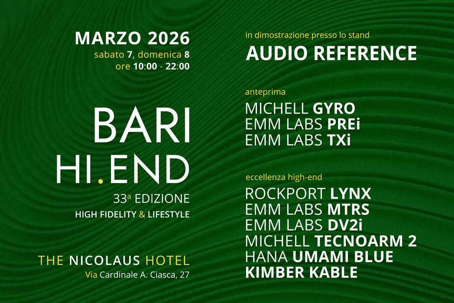 Audio Reference vi aspetta alla manifestazione Bari Hi-End nei giorni sabato 7 e domenica 8 marzo 2026, dalle ore 10 alle ore 22, presso The Nicolaus Hotel, in via Cardinale A. Ciasca, 27, 70124, Bari, con l'anteprima del nuovo giradischi Michell Gyro, del nuovo preamplificatore EMM Labs PREi e della nuova meccanica di trasporto per compact disc EMM Labs TXi, utilizzati in un impianto stereofonico high-end di prestigio.