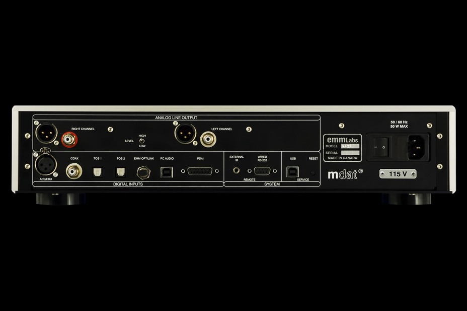 Convertitore Digitale / Analogico stereo 24 bit, 44,1-192 kHz, DSD su USB (DoP 1.0), tecnologia MFAST™, tecnologia MDAT™, ingressi audio digitale EMM Optilink, AES EBU, USB, SPDIF coassiale, 2X SPDIF Toslink, porta d'espansione EMM.